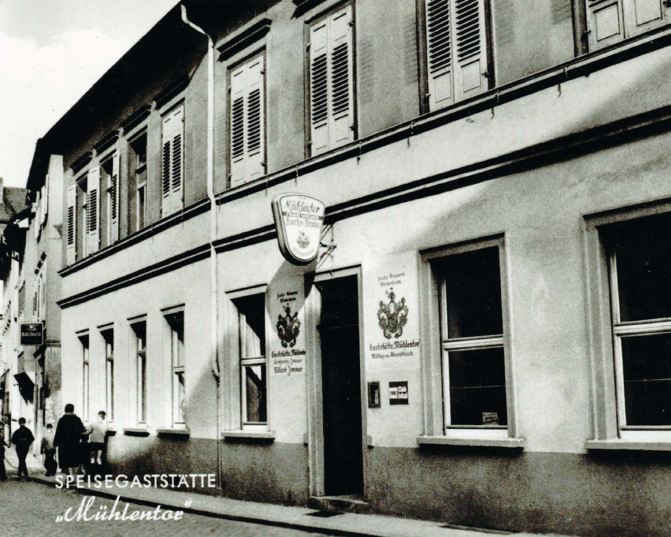 1942 kauft die Fuchs Brauerei das Gebäude, richtet wieder eine Gaststätte ein und eröffnet sie unter dem Namen „Zum Mühlentor“. In den 1950er-Jahren wird das Haus umgebaut, später prägt Fußball-Idol Adam Schmitt als Pächter die Gastwirtschaft. Das Mühlentor wird in dieser Zeit zu einem lebendigen Treffpunkt für Einheimische, Sportbegeisterte und Gäste der Stadt.